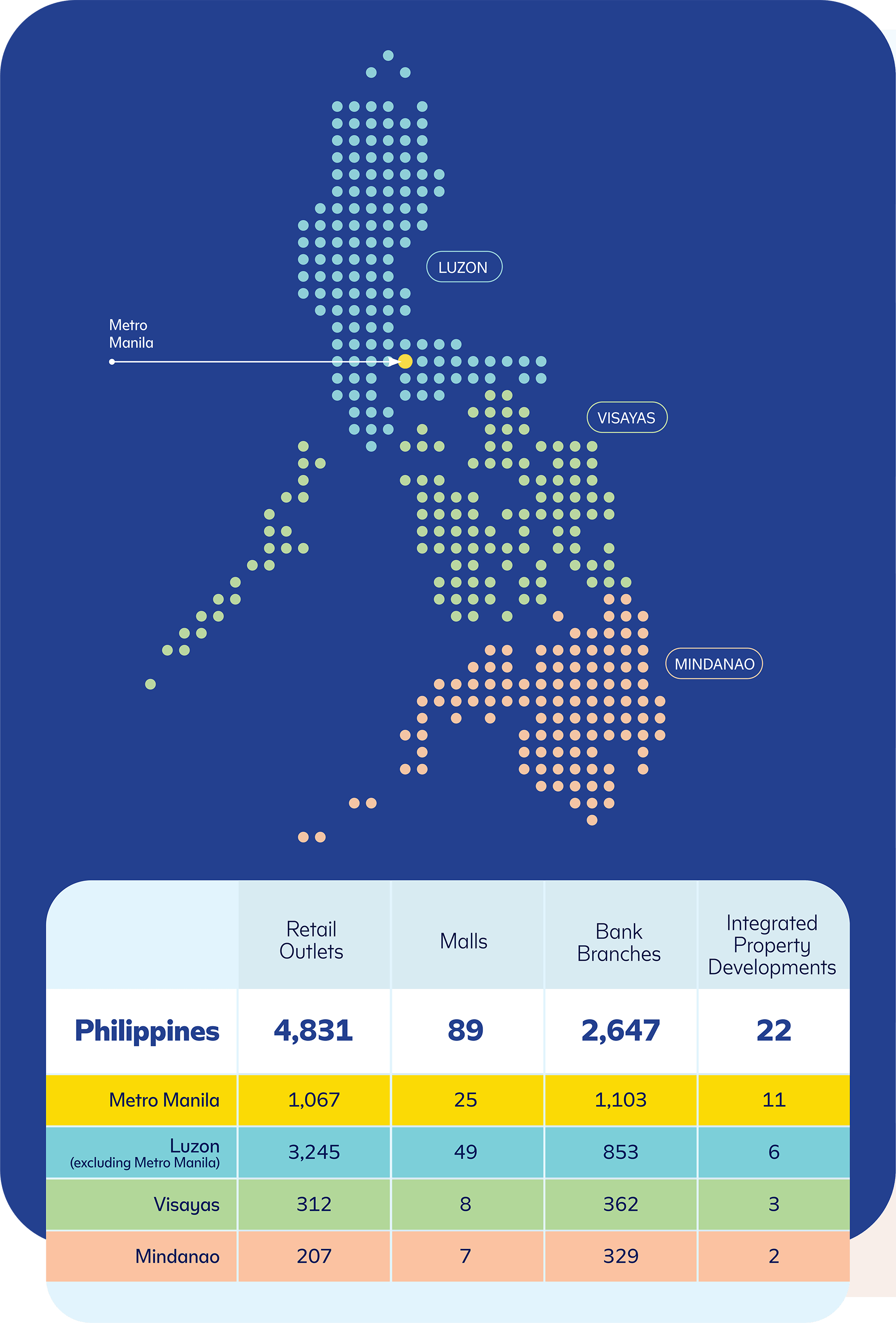 Our Businesses Retail We create access to modern retailing to address the needs and aspirations of Filipinos Banking We deliver a full range of banking services and enable growth and financial inclusion Property We build Integrated Property Developments centered on our malls as community centers Portfolio Investments We invest in high-growth sectors that have synergies with our core businesses Our Business Footprint Our ecosystem of businesses extends nationwide